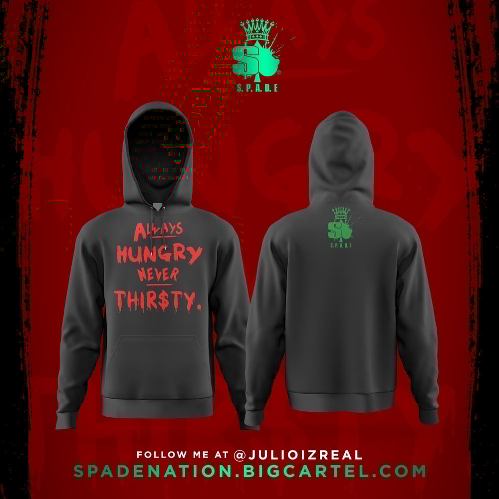 black soft-style cotton long sleeve hoodie with pocket. red design on front with green spade logo on back.